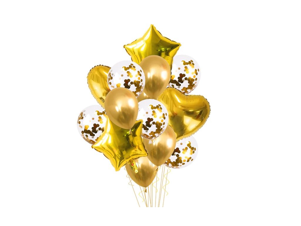 Balenie obsahuje: 1x tubu na nafúknutie fóliových balónikov 2x veľké zlaté fóliové balóniky v tvare srdca 2x veľké zlaté fóliové balóniky v tvare hviezdy 5x svetlé balóniky s konfetami vo vnútri5x zlaté balóniky1x zlatá farebná páska (tenká lepiaca páska)